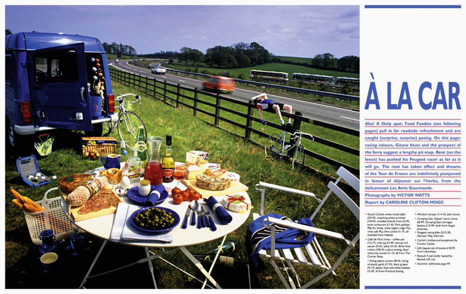 Series of picnics for The Observer magazine, each one featuring food, car and models themed as French, Italian, American and Swedish, -as they might have a picnic in the UK. The French one it was decided should be in a lay-by!